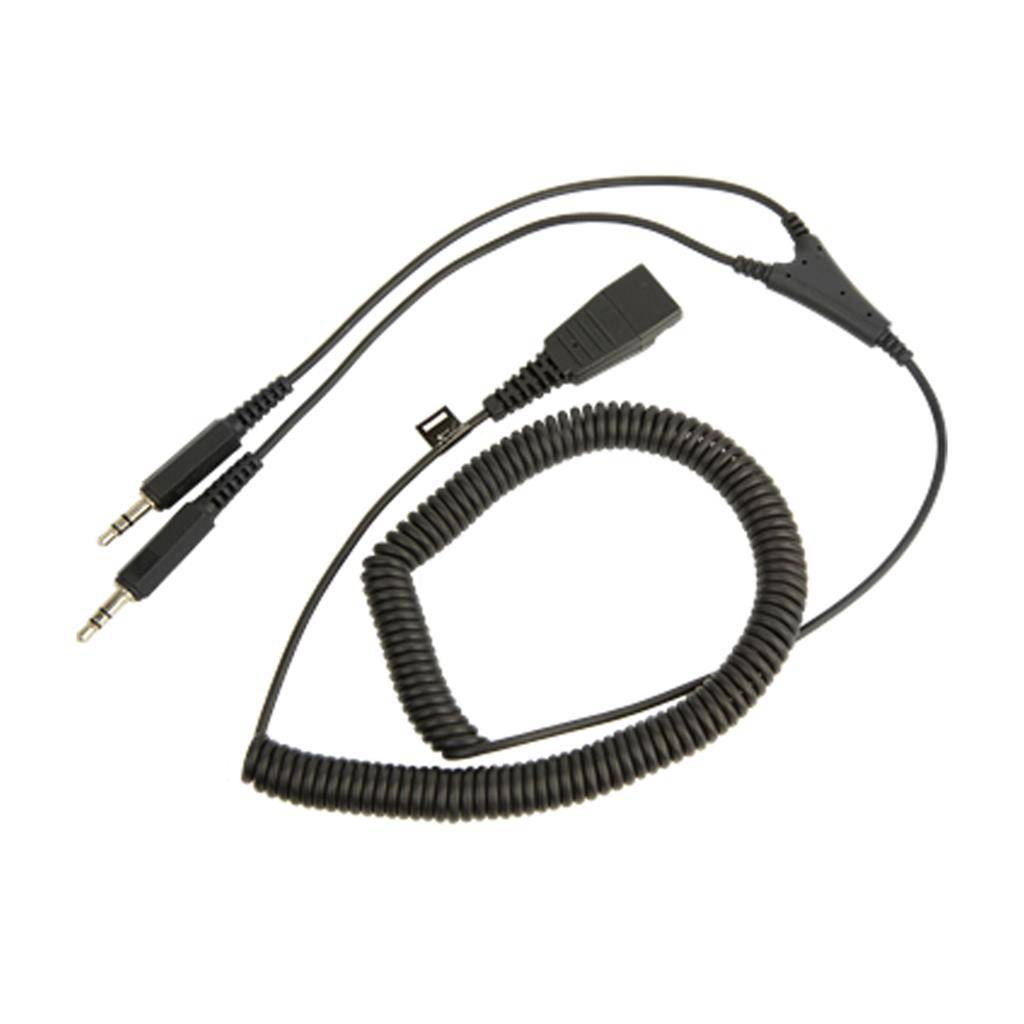 Sluit je Jabra GN kantoorheadset aan op je pc. Deze kabel wordt gekoppeld aan je Jabra headset met de platte QD aansluiting en loopt over in 2 x 3,5 mm jackaansluiting.