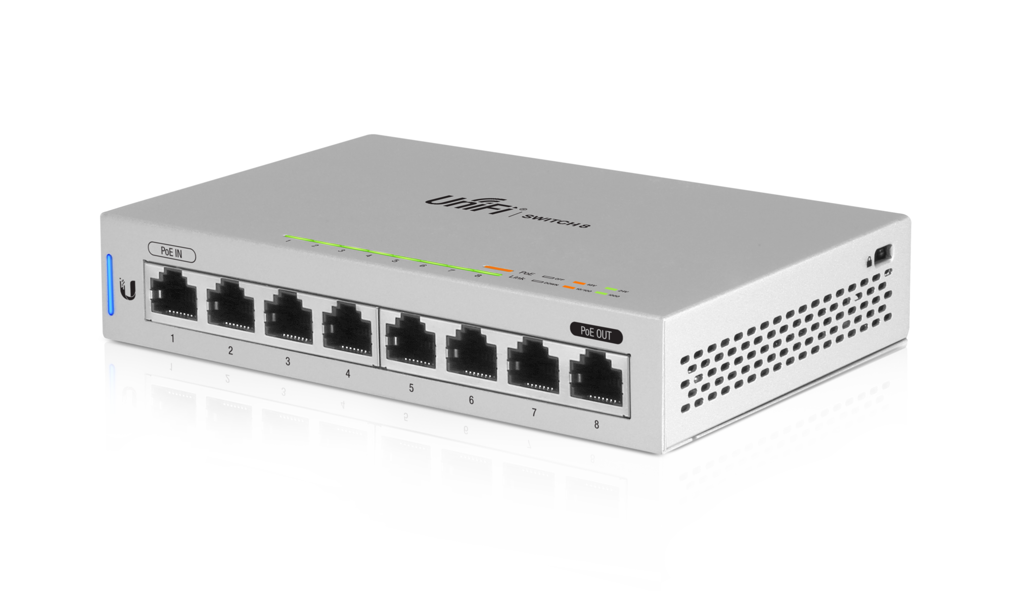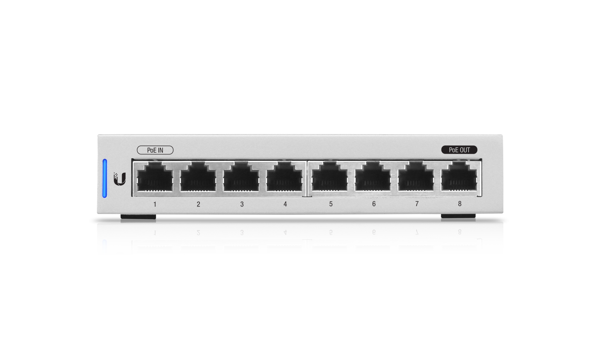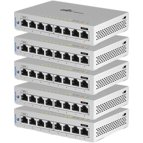 US-8 is een Gigabit PoE-switch van Ubiquiti Networks in desktopversie met één PoE IN- en één PoE Out-poort. Managed switch met 8 Gigabit poorten en 16 Gbps totale doorvoer. Het grootste voordeel van switch is een Gigabit Input POE op poort 1 en Gigabit Output POE op poort 8. De switch kan worden gevoed via DC-aansluiting of via ethernet met actieve 802.3af/at of passief (24V en 48V) PoE. De switch kan een ander apparaat voeden dat is aangesloten op de 8e poort met een maximaal verbruik van 12Watt met hetzelfde vermogen als de switch.