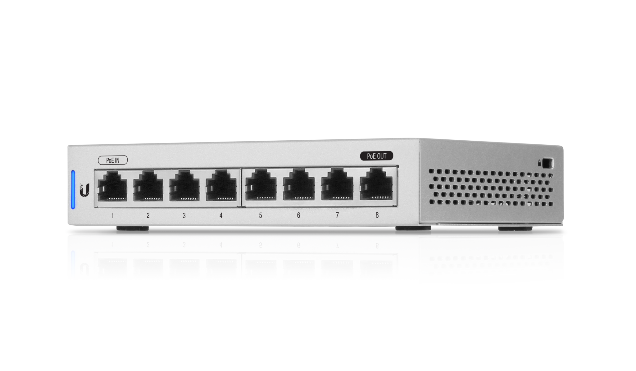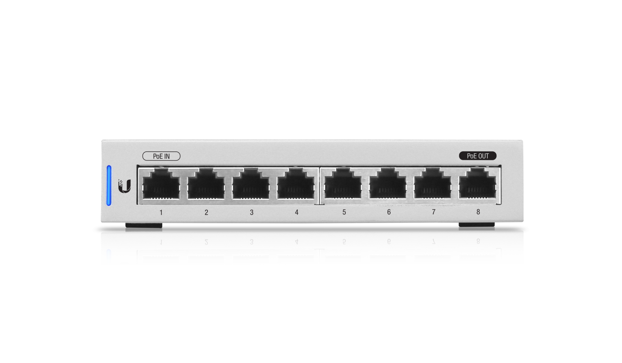 US-8 is een Gigabit PoE-switch van Ubiquiti Networks in desktopversie met één PoE IN- en één PoE Out-poort. Managed switch met 8 Gigabit poorten en 16 Gbps totale doorvoer. Het grootste voordeel van switch is een Gigabit Input POE op poort 1 en Gigabit Output POE op poort 8. De switch kan worden gevoed via DC-aansluiting of via ethernet met actieve 802.3af/at of passief (24V en 48V) PoE. De switch kan een ander apparaat voeden dat is aangesloten op de 8e poort met een maximaal verbruik van 12Watt met hetzelfde vermogen als de switch.
